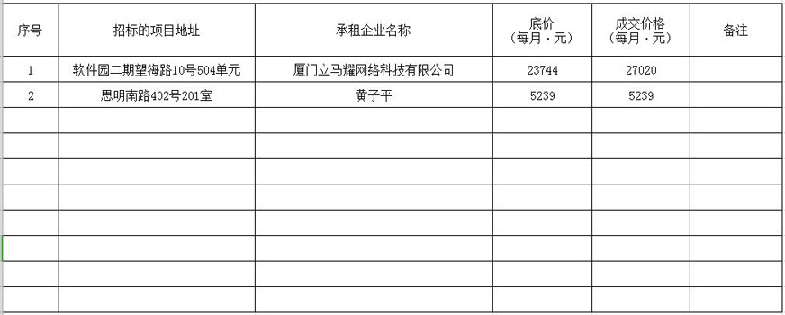 根據(jù)思明區(qū)國有企業(yè)資產(chǎn)出租管理的相關(guān)制度,我司2019年11月18日上午9:00起于觀音山營運(yùn)中心2號樓2層2號會議室進(jìn)行公開招租現(xiàn)場開標(biāo),現(xiàn)通過思明控股網(wǎng)站對外發(fā)布成交公告,內(nèi)容如下: