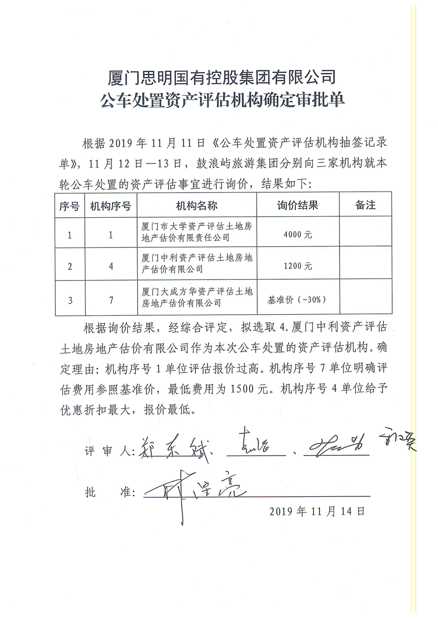 2.《思明控股公車處置(第四批)資產(chǎn)評估機構確定審批單》;