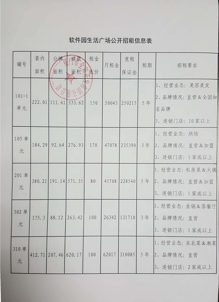 4、招租要求:詳見(jiàn)附表(軟件園生活廣場(chǎng)公開招租信息表)