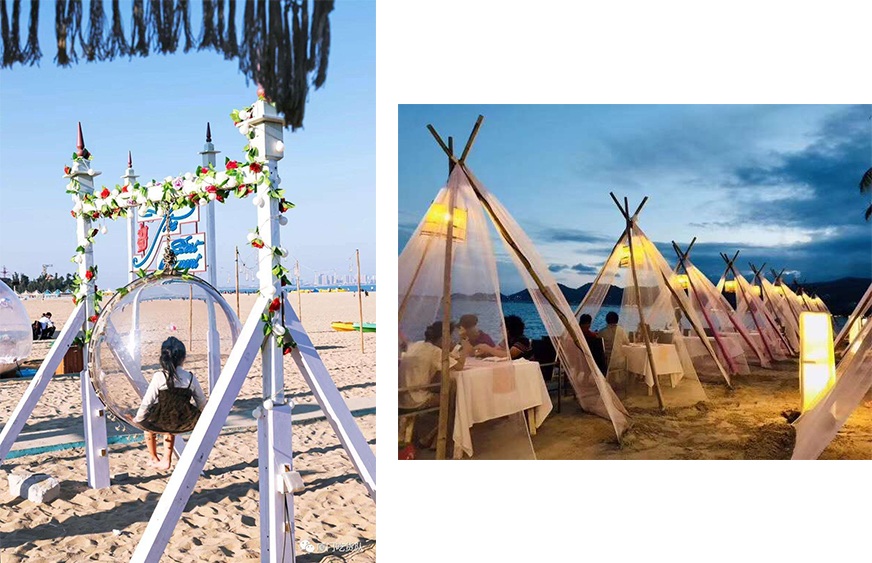 沙灘上浪漫而有趣的泡泡屋及帳篷,極具熱帶風(fēng)情的椰子樹等裝飾,過往行人無不駐足拍照,據(jù)說這是觀音山在抖音上知名的“網(wǎng)紅地”,看似忽然爆紅的背后,它的創(chuàng)始人楊翰斌其實(shí)在觀音山這片“碧海金沙”中已5年有余,獨(dú)到的思維及眼光讓他從一批批不停更迭的商戶中脫穎而出,成了他在得天獨(dú)厚的環(huán)境中生存與“淘金”的制勝法寶。